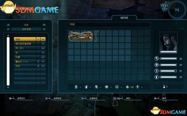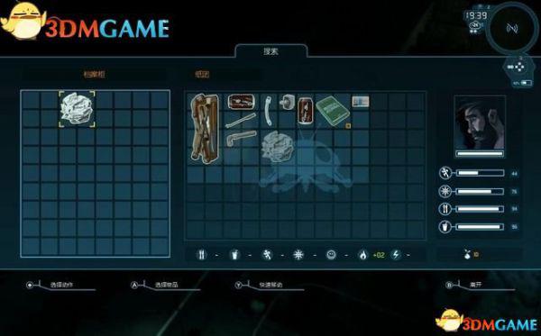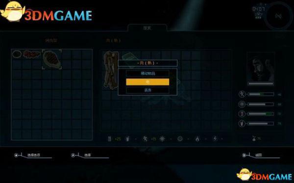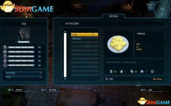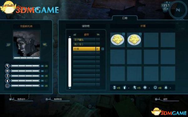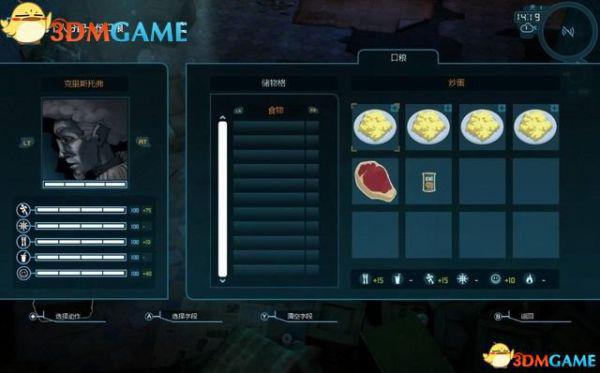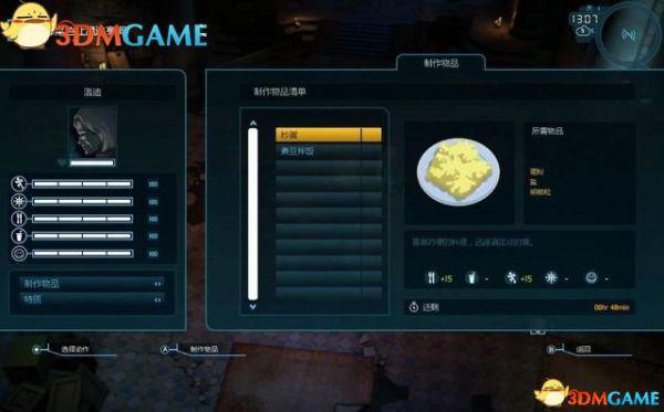 如图的左边是储藏区的菜单。你找到以及制作的物品都会存放在这里。储藏区里物品可用来制作升级。如若需要,队员会自行使用补给品。相关数值变低时,他们会自行取用食物和饮料。