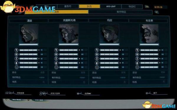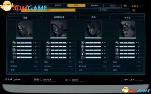如图是队伍菜单,它让你可以看到队员的数值,目前正在进行的活动,以及拥有的技能。