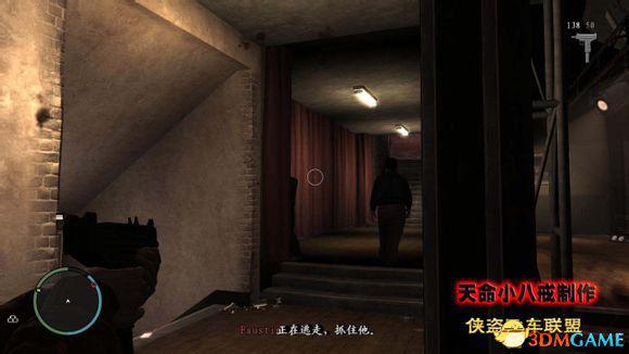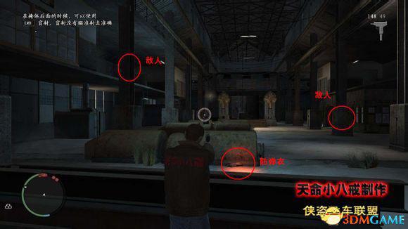 到达目的地后,这里教导的是如何使用掩体进行枪战,靠近墙壁后按“Q”作为掩护,然后按右键瞄准左键射击后就会退回到掩体,不过在这里有扇门比较麻烦,建议这里还是不要用掩体比较方便,直接进门干掉楼梯上的敌人比较方便。