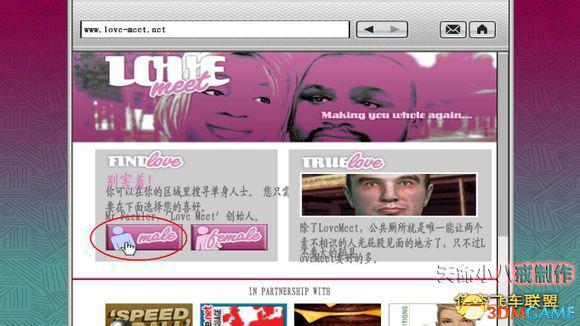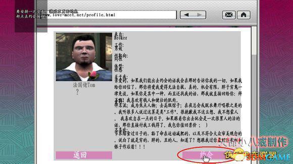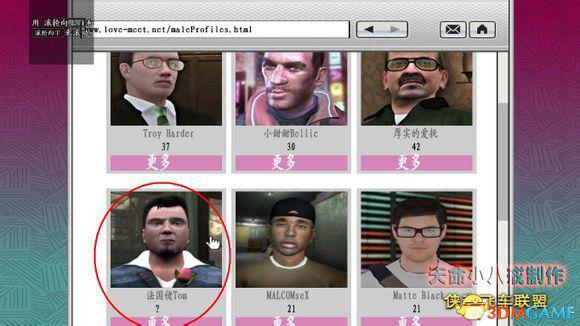 去到网吧,在网页的右侧就是Love meet,进入后选择蓝色的male按钮,接着就看到很多男性的照片,找到“法国佬TOM”,点进去,选择“约会”,然后退出网页,任务暂时告一段落。(顺便那个“小甜甜Bellic”就是Niko,可以点进去看介绍,都是Roman恶搞的简介)
