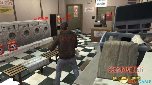 目的地洗衣房就在酒吧后面两个街区,进入洗衣房后,Niko刚说出Vlad的名字,老板就把一筐衣服丢向Niko,然后转身逃跑了。