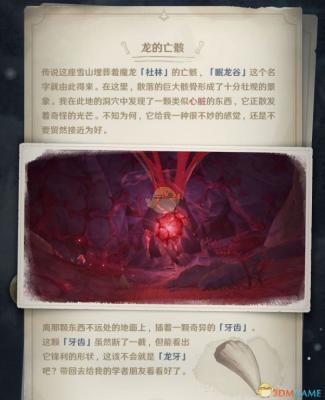 传说这座雪山埋葬着魔龙「杜林」的亡骸,「眠龙谷」这个名字就由此得来。在这里,散落的巨大骸骨形成了十分壮观的景象。我在此地的洞穴中发现了一颗类似心脏的东西,它正散发着奇怪的光芒。不知为何,它给我一种很不妙的感觉,还是不要贸然接近为好。