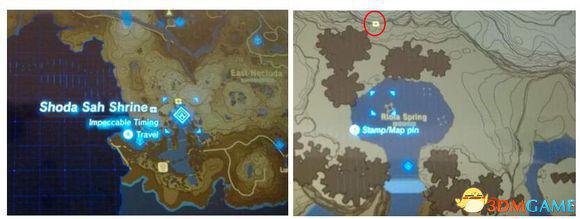位置如图所示,看不懂看神殿名称,Shoda Sah Shrene,找不到的看优酷视频,传送到神殿后,直走跳进水里,登上前面的瀑布,看到一个中间有#的湖,最后爬一小段山,最后来到宝箱的位置。
