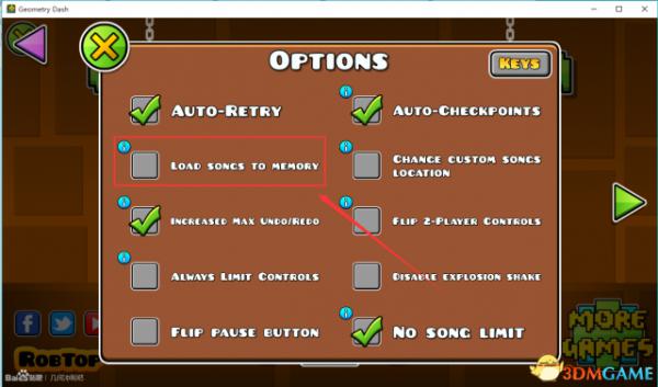 这个选项是在每关开始前把音乐加载到运存中提高性能,如果运存不足,会导致游戏没声音。