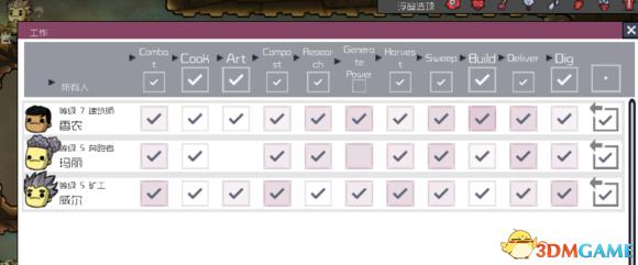 工作页面从左到右为猎杀生物,做饭,艺术,肥料,研究,人力发电,收割植物,进行普通优先度运输,建造,进行高优先度运输,挖掘。