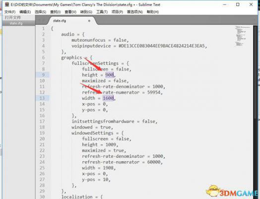 2)用记事本打开文件夹中的state.cfg配置文件,将这两项分别修改为height 900和width 1600。