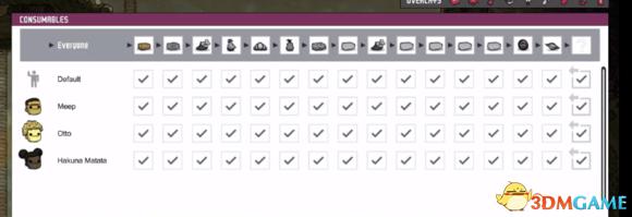 另外鉴于上面说的食品品质要求,这里多了一个消耗品的使用界面,简单来说就是你可以选择小人吃什么,唔,食物还挺多的