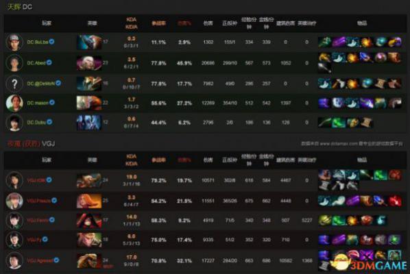 11分钟DC中路先手,VGJ前期输出有限,面对火猫的冲脸毫无办法,大娜迦没状态也没来,DC1换3,猴子换掉VGJ的大树凤凰VS。比赛来到15分钟,VGJ经济经验落后不多,但是局面上DC掌握了主动。