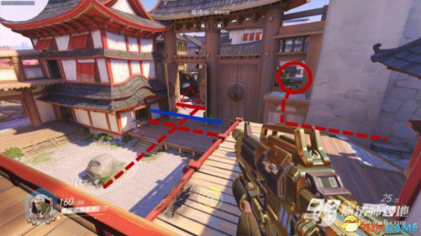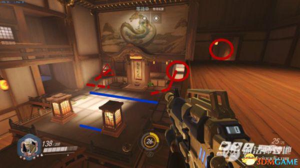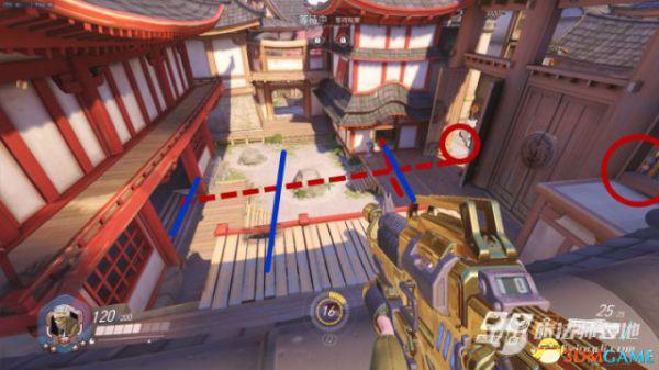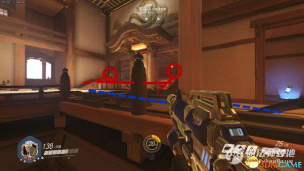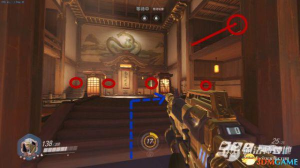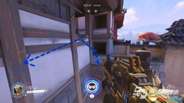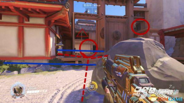 高台站位适合己方阵容为2T2C2辅。此时咱们可以选择高台站位输出,通过火箭跳跳到下图的位置进行防守输出,高台站位的弊端是视野很少。而且不安全,容易受到地方源氏法拉等英雄的骚扰。