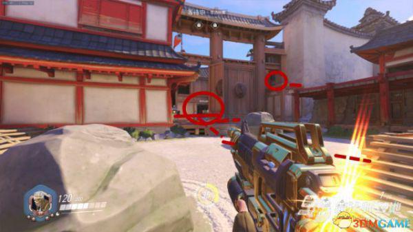 这里我推荐大家在平地输出。这时可能有人会问以前都强调是高位输出,为什么现在要平地输出,之前的攻略都是推车图打的是运动战,所以高位输出吃香。但是在守点图中A点的进攻入口很少而且花村这个图A点的高位输出比较危险,视野还少,所以不推荐大家高位输出。而是依靠A点屋前的两块石头当掩体进行正面输出,在平地输出相比高位输出的危险比较小。如果后排遭到切入,己方副T位也能快速的支援。