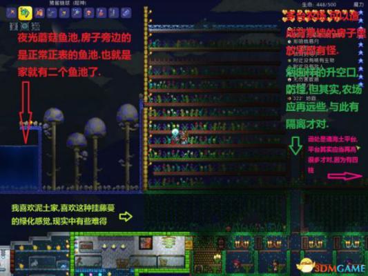 以出生点床的位置为中心是一个十字形通道.横道为主要用来与上面NPC交易.竖道主要用来迅速升空调走BOSS在半空平台战斗以及采集屋顶农场.越靠近出生点位置越是常用功能区.最边缘是装备展示区,将多余的装备用假人,武器架,展示架上展示既漂亮又省下核心区域空间.强烈推荐.