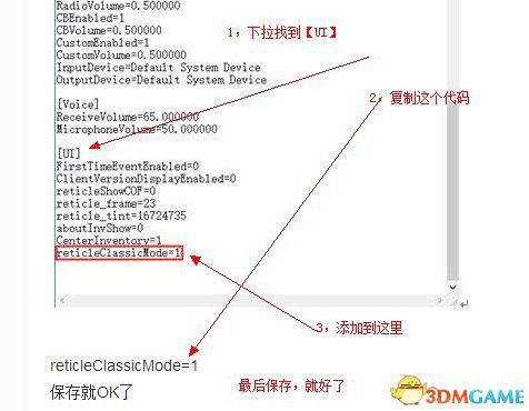 4、在文档中找到 [UI] 这一项,复制代码 reticleClassicMode=1 到图中的位置,保存。
