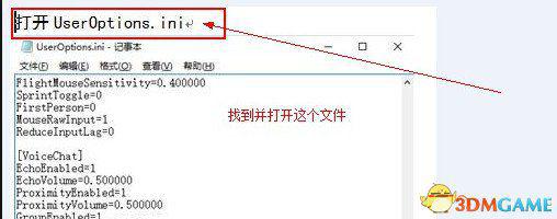 3、在游戏目录中找到 UserOptions.ini,使用记事本打开