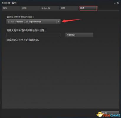 2.在属性中找到测试选项卡,点击测试版本选项,在下拉框中选择0.15x -Factorio,这个选项的含义是自动更新到异星工厂0.15的最新版本。