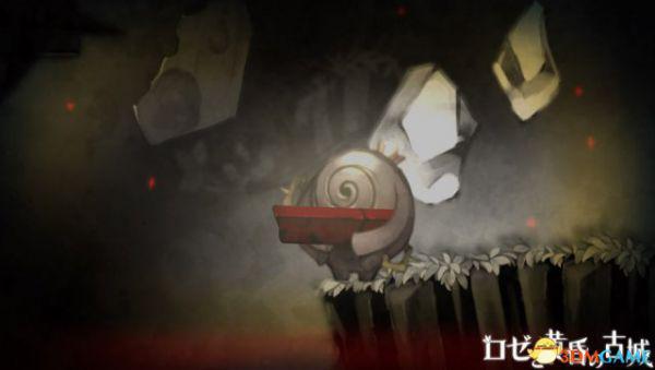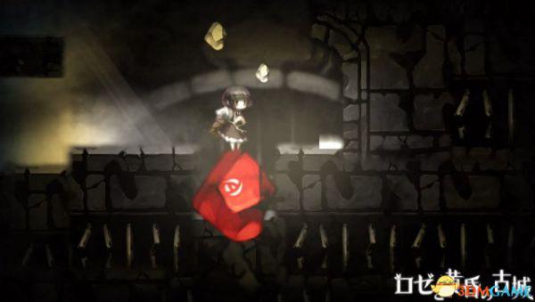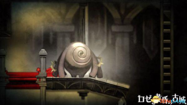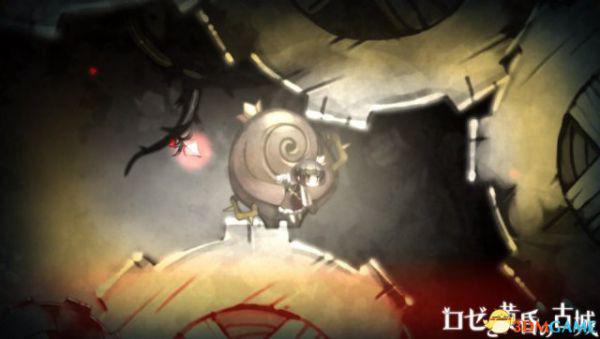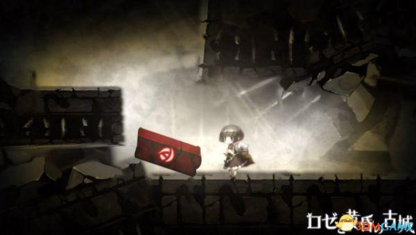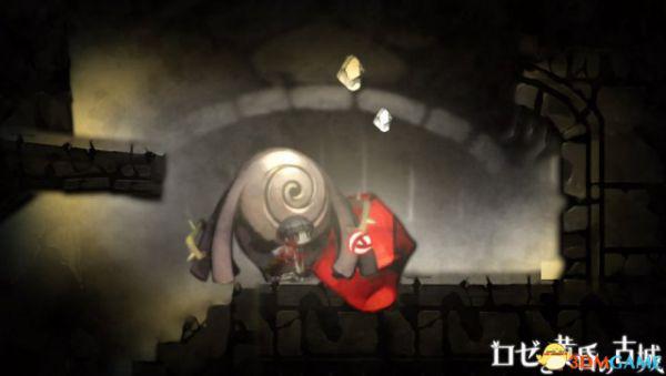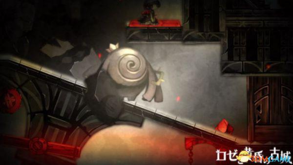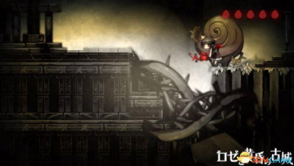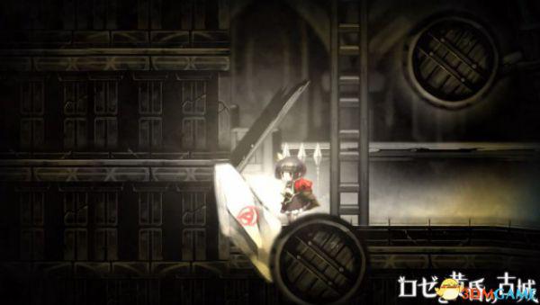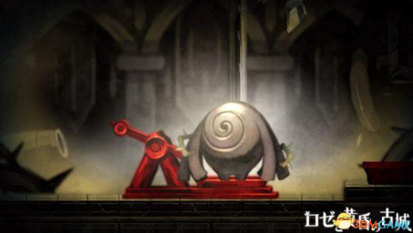 7.石巨人从左侧可以拾取到一块石柱。并且将石柱扔到投石机上。萝洁将身上的血液随意附着在石头上后乘电梯上去。巨人启动投石机,萝洁则跳上慢慢飞起的石头。