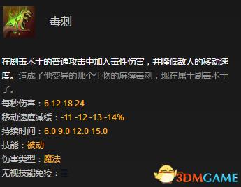 但是现在中单剧毒前期是1,2对点,不跟对手走猥琐路线,强势到底。事实上一级毒刺就有每秒6点的伤害,这跟回复指环的回复量是一样的。而两级伤害是每秒12点,这跟吃树的回复是一样的。至于之后18点的伤害,跟伐木机三级被动的回复也差不多。等级相同的情况下,毒刺完美压制被动,需要叠加的被动只要被剧毒A一下就会抵消,这也就解释了为什么线上一霸伐木机在剧毒面前也如此吃亏。所以大多数英雄在线上面对剧毒的被动时都是处在劣势的。