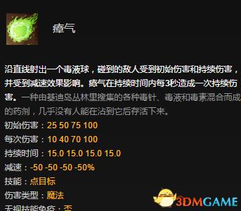 瘴气这个技能集杀人和消耗为一体,50%的减速配合带有被动的普攻,一次瘴气消耗对方英雄一半的血丝毫不是问题。