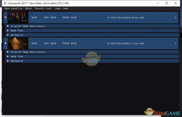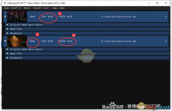 步骤4:打开的第一个存档里面的人物捏脸是我想要的,第二个存档的进度是我想要的。于是点击第一个存档的copy skin,然后点击第二个存档的paste skin,再点击save就完成了。