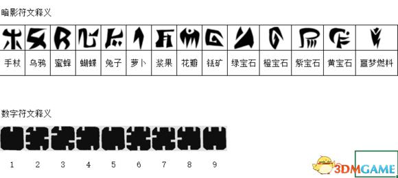 本关中,解谜双方的“输入框”上都会有一排文字:输入框内是数字符文的玩家上面是暗影符文,输入框内是暗影符文的玩家上面是数字符文。数字符文和暗影符文是对应的。举例来说,如果双方的顺序是这样:
