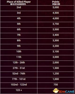 新的击杀分数奖励规则(你击杀的玩家的排名对应的奖励分数):