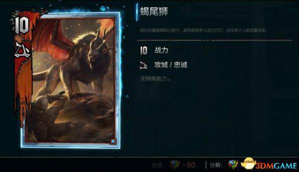蝎尾狮与其他势力的10战力银色单位一样,不附加任何特殊能力,但是提供大量战力。是新手的好哥们,配合怪兽势力的留场能力,有机会产生多倍收益。