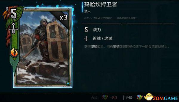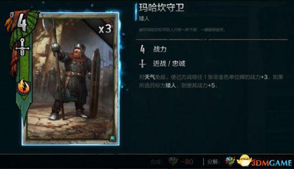 玛哈坎卫士:4战力,近战排。对天气免疫。使己方战场 1 个非金色单位的战力+3。如果所选目标为矮人,则使其战力+5。
