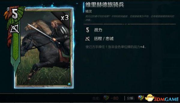 维里赫德骑兵:5战力,远程排。使己方手牌中的 1 个非金色单位的战力+4。