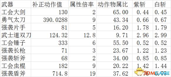 所有武器都是选了最常用的风格,动作值都带上了基础武器的基础补正,比如太刀气刃和满气,盾斧红瓶,战斧强击,棍子红灯等等,所选用的动作是个人使用及视频中聚聚使用频率最高的动作,并且给了这些动作一定的权重,用以最终衡量武器的平均物理动作值。