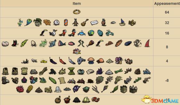 下面是能供奉给祭坛的物品清单: