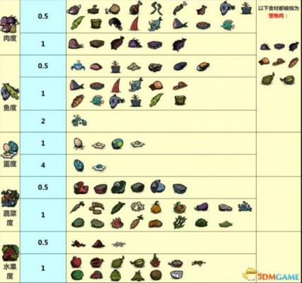 表格当中肉、鱼、蔬菜、蛋、水果等为一类食材总称,这些总称后面的数字为该类食物系数,玩家放入的食材只需要满足这个系数即可,不需要放入特定的食材,各类食物悉数如下所示: