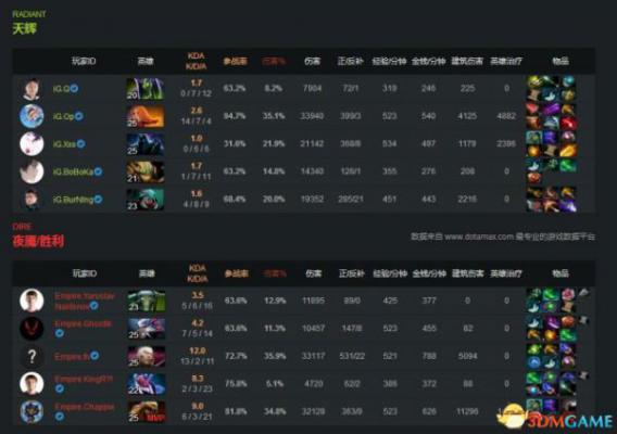 35分钟高地打麻将的帝国,蓝猫抓死刚刚出门想带球的土猫逼高地,逼出帝国买活撤退,此时帝国酱油已经穷的没什么装备了。最后一波团战冰龙位置暴漏成功勾引到了帝国经济最好的巨魔,巨魔被B神扣晕击杀后,没有巨魔的帝国没有办法继续整个团战,直接打出GG,恭喜IG2:1获胜!