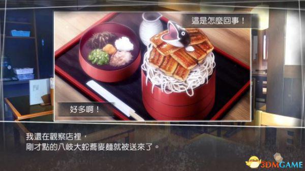 神在庵的店员三平递来一份菜单,主人公点选一份份量超大的『八歧大蛇荞麦面』。随便调查一下店内,面食就送上来了。