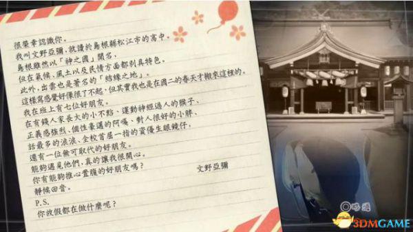 设定完自己的姓名之后,开始调查自己的房间的书架,找到一叠与岛根县的文野亚弥的书信。