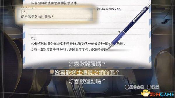 这里就要开始回信了,这也是本部作品的特色系统,在读到亚弥信末的PS部分时,玩家要通过选项选择,组合成自己十五年前回复的内容。(注意:目前是单流程攻略,当中这种自由选择并没有参考作用,至于每个选项的背后意义和对结局的影响,之后会逐一补全。)