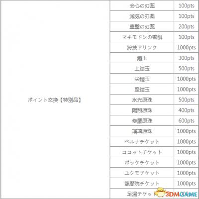 怪物猎人XX兑换道具及所需点数