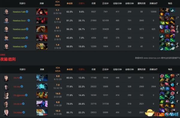 35分钟OG开雾,在野区抓到拉比克后直接打盾,NB在先手秒掉谜团的情况下被黑鸟后手切入大招打出爆炸输出,团灭之后OG带盾,而Newbee阵容再无一战之力,中路被破后直接打出GG。