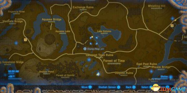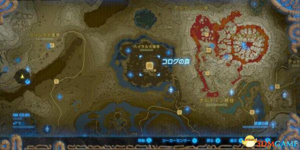 大师剑的位置在地图北部的海拉尔大森林【Great Hyrule Forest】,穿过迷雾森林【Lost Woods】,来到【Korok Forest / コログの森】