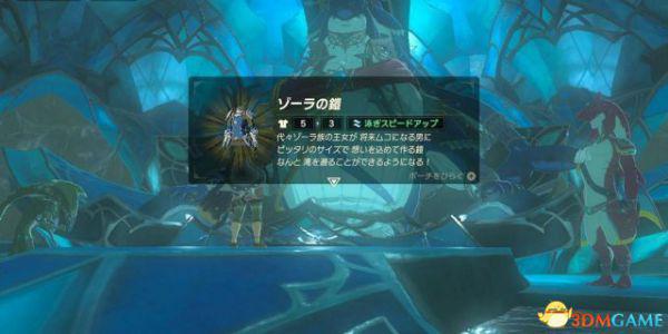 和佐拉之王对话后,获得装备“佐拉之铠”【Zora Armor / ゾーラの鎧】,效果是:游泳加速、在瀑布前按(A)可以直接攀上瀑布。