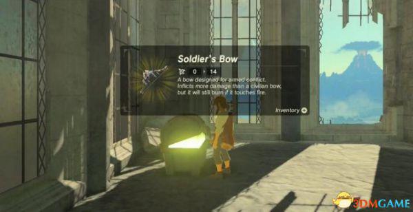 神殿旁边有楼梯,爬上去,在钟楼内可发现一把士兵之弓。
