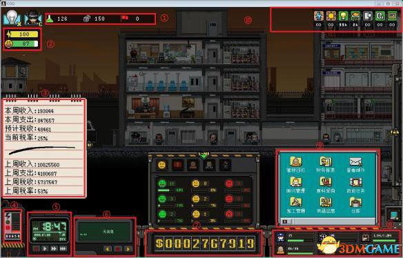 8:监狱各种“库存”,分别是狱警(现在版本没用),声望(白道),仓库,犯人和囚室,威望(黑道),枪械库(需解锁地下3层)