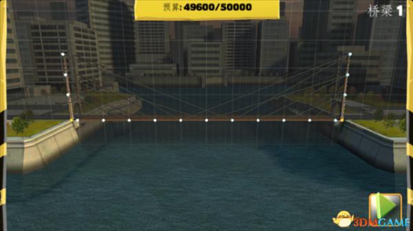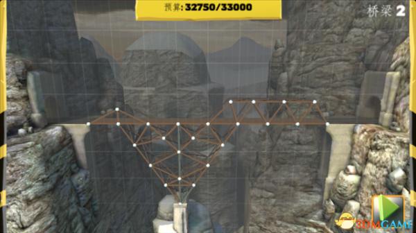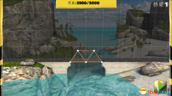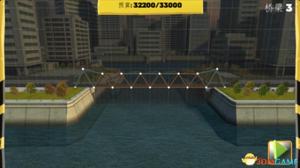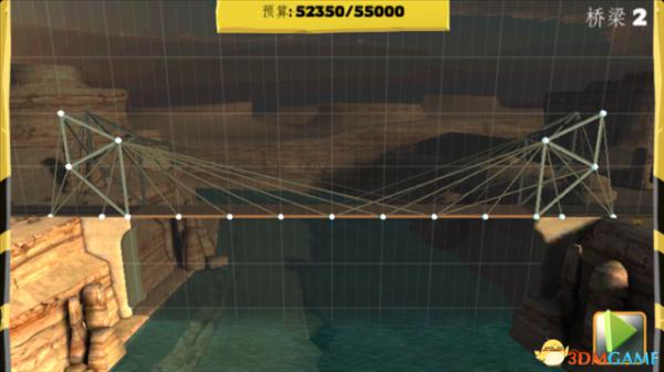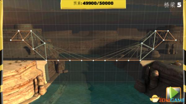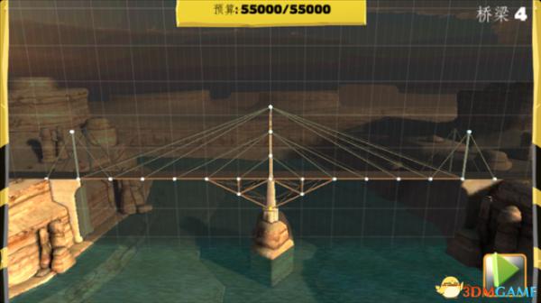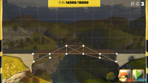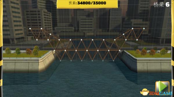 这一关添加的素材混凝土这种材料坚固程度无可厚非,比所有材料都结实,受到重大受力所有材料都会在它之前断裂,所以不可能倒塌断裂。但价格昂贵建议尽量不用,虽然这关提供了混凝土和黄色锚点(混凝土只能在黄色锚点建设)但这关完全不用。这关难点在于右侧第二个锚点下方支撑角度太小会不受力,所以角度要大一点尽量保持三根材料一条线,这样才不会失掉撑力。可以看到最两侧锚点没有支撑,因为两侧断崖上已经有锚点链接(这里就说到桥面不光起到过车的作用,左右锚点是联通的,受理时会起到拉力的做用),受力十分稳定,所以所有下方支撑的结构一侧锚点都不用支撑。