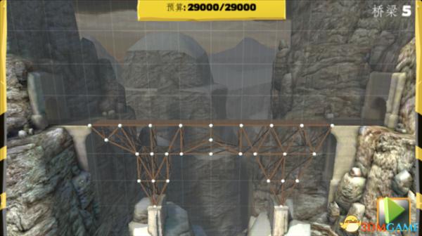这一关又给了一种新材料钢材,特点撑力比木材大很多价格贵,拉力比钢索大价格贵,价格比混凝土便宜但坚固度不及,四种素材里只有木材和钢材可以做桥板。刚才说带价格,应为钢材价格比较木材钢索贵,所以也是尽量不用,主要是得高分嘛。断崖上多给出了两个锚点,没有钢索这种跨度木材拉力不够,所以利用给的两个锚点用木材支撑一下,这回就没问题了