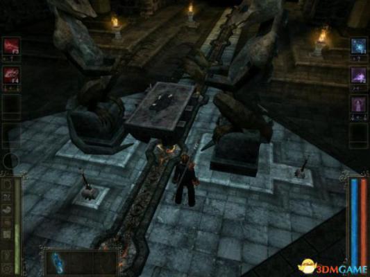 刚一进入大走廊,恶魔小头目会指挥他的部下来围攻你,说完话它自己进入召唤门所在的房间并用魔法把门锁上了(就知道不可能那么容易)。清理干净之后发现无法打开门,四处闲逛,在左侧下方发现一个被锁着的恶魔,它说只要你把它放出来,它就帮你开门。解放恶魔需要一块绿色能量水晶和咒语。来到右侧的一个房间,进去后恶魔会启动一群奇怪的装置来进攻你(会走路的锤子?)锤子能一击将人打倒。清理掉之后走到房间尽头,拿到水晶。回去报告恶魔,它说知道咒语的法师被恶魔关了起来,而且脑子有问题,必须用“Syrahs”这个名字来刺激他。来到右侧最上方的房间,走到最里面的监牢,找到法师,果然满嘴胡言乱语,这样子根本问不出什么咒语来,但用名字刺激他之后他给了你一把钥匙,能打开正对着大走廊另一侧的房间。进去后发现五幅画,点击顺序如下:左2右2右3左1左3(从门口方向数),点击成功后主角被画吸了进去