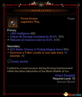 太古是词缀最完美的远古物品。这就意味包括一级、二级和传奇在内的词缀都拥有最理想的值,无论那应该是最大值还是最小值。要知道,物品猜不到你的配置最需要什么样的完美词缀,因此它们将依据一套具体的规则去roll点。首先,掉落装备的主属性肯定会匹配你的职业(野蛮人/圣教军为力量,猎魔人/武僧为敏捷,巫医/法师为智力)。其次,该物品总会拥有最理想的插槽数量(胸部3个,腿部2个,首饰1个,武器0个)。