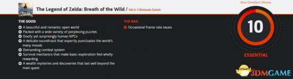 GameSpot也给出了10分满分评价,并称“《塞尔达传说 荒野之息》是任天堂最有野心和最令人印象深刻的游戏”。