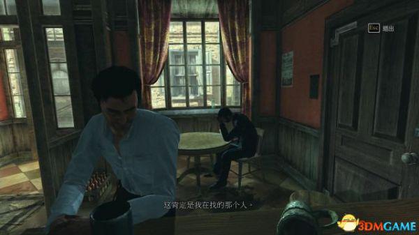 step7.回到酒吧门前附近的吧台坐下,观察窗旁的男子的胡须以及台上的酒杯(里面装的是水)。