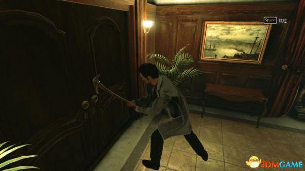正当敲门时,屋内传来了艾尔伯特的呼叫声,立马从门廊旁侧的盔甲处拿取一把斧头将门劈开,需要劈砍5到6次,每次需要对准红圈范围并且点击鼠标左键发力。