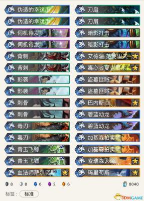 Q&A:有人可能会说毒刃用来过牌会不会导致后期伤害的不足?我的解答是:并不会,因为这套牌组还有青玉飞镖的加入,可以与蓝龙做Combo,可以更放心的将毒刃做为前期过牌的手段,但还是要提防对手的野性之怒来增加16点护甲值以及为了占下场面交出伤害的你导致后期伤害不足,这些因素就要看玩家对整副牌组的了解以及经验来判断了。