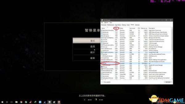 进入游戏后alt+tab打开任务管理器找出游戏的PID,如下图,每次重新进入游戏PID都会不一样的。