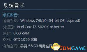 该“高清材质包”DLC对系统配置要求颇高,CPU要求i7-5820K或更高级别处理器,内存则是要求8GB,显卡则是GTX 1080 8GB,而对存储空间则要求58GB的可用空间。